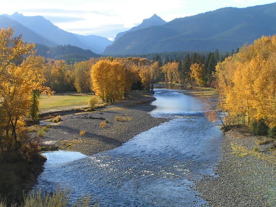Autumn on the Bitterroot River in Montana, where golden cottonwoods line the banks beneath the Bitterroot Range.
